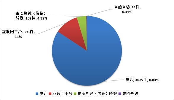本月全市12315投诉举报机构共接收信息3600件。其中,咨询2371件,投诉914件,举报315件,分别占总量65.86%、25.39%和8.75%。投诉举报办结960件,按期办结率100%,为消费者挽回经济损失20.54万元。信息接收渠道情况详见下图: