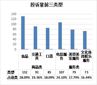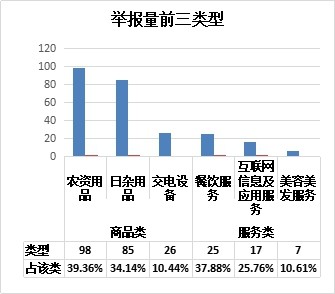 本月,商品类投诉470件,服务类投诉444件,各占投诉量51.42%和48.58%;商品类举报249件,服务类举报66件,各占举报量79.05%和20.95%。投诉举报量排名前六位的类型详见下图: