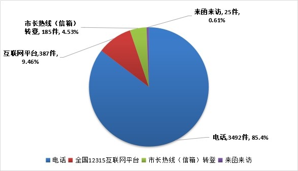 本月全市12315投诉举报机构共接收信息4089件。其中,咨询2831件,投诉946件,举报312件,分别占总量69.23%、23.14%和7.63%。投诉举报办结1004件,按期办结率100%,为消费者挽回经济损失23.6万元。信息接收渠道情况详见下图: