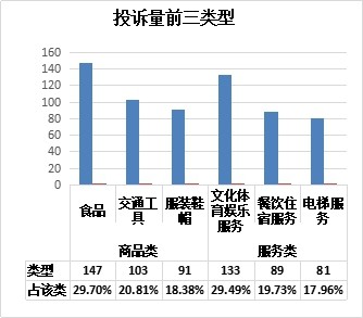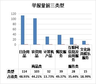 本月,商品类投诉495件,服务类投诉451件,各占投诉量52.33%和47.67%;商品类举报233件,服务类举报79件,各占举报量74.68%和25.32%。投诉举报量排名前六位的类型详见下图: