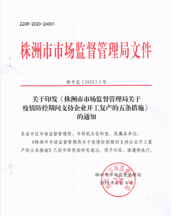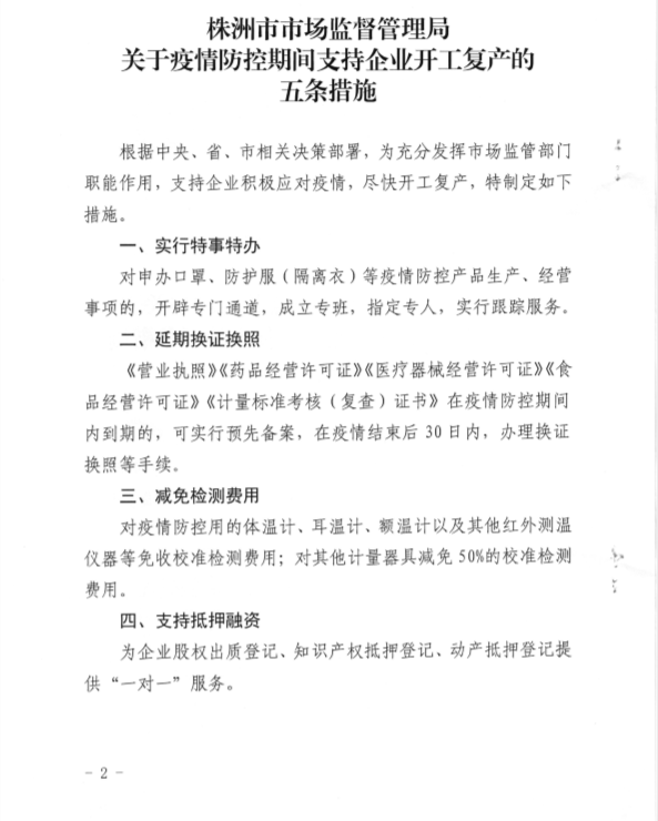 关于印发《株洲市市场监督管理局关于 疫情防控期间支持企业开工复产的五条措施》 的通知