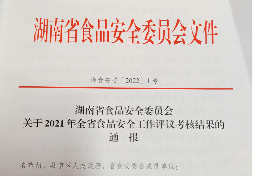 炎陵县喜获全省2021年食品安全工作A级(先进)单位