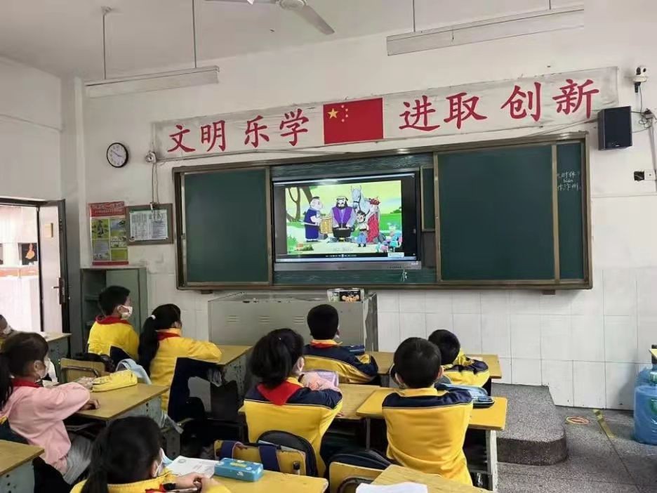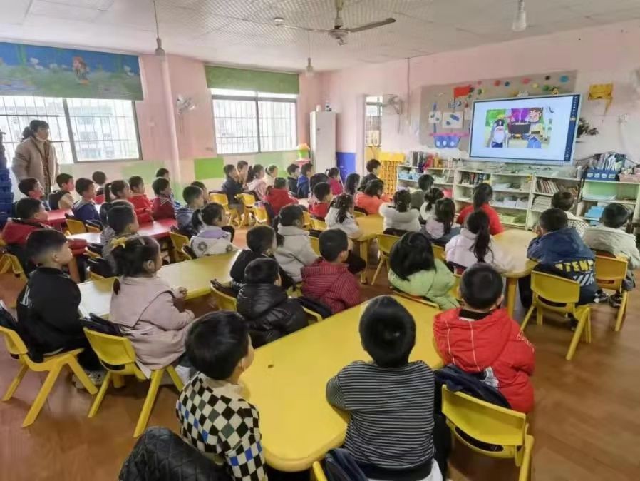 芦淞区董家塅辖区小博士幼儿园小朋友坐在一起观看毒蘑菇动画教育视频。